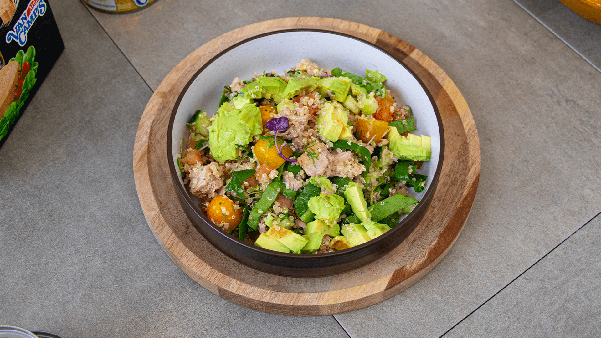 - Disfruta de una saludable y deliciosa ensalada de atún con quinua ya aguacate.